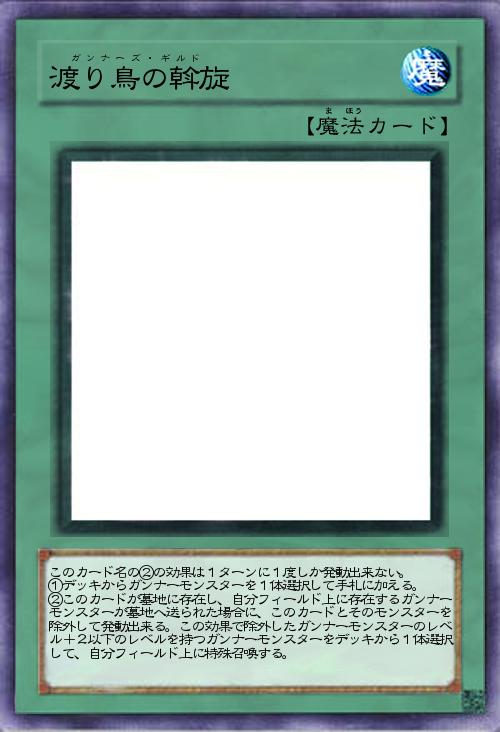 | このカード名の②の効果は1ターンに1度しか発動出来ない。 ①デッキからガンナーモンスターを1体選択して手札に加える。 ②このカードが墓地に存在し、自分フィールド上に存在するガンナーモンスターが墓地へ送られた場合に、このカードとそのモンスターを除外して発動出来る。この効果で除外したガンナーモンスターのレベル+2以下のレベルを持つガンナーモンスターをデッキから1体選択して、自分フィールド上に特殊召喚する。 | |||