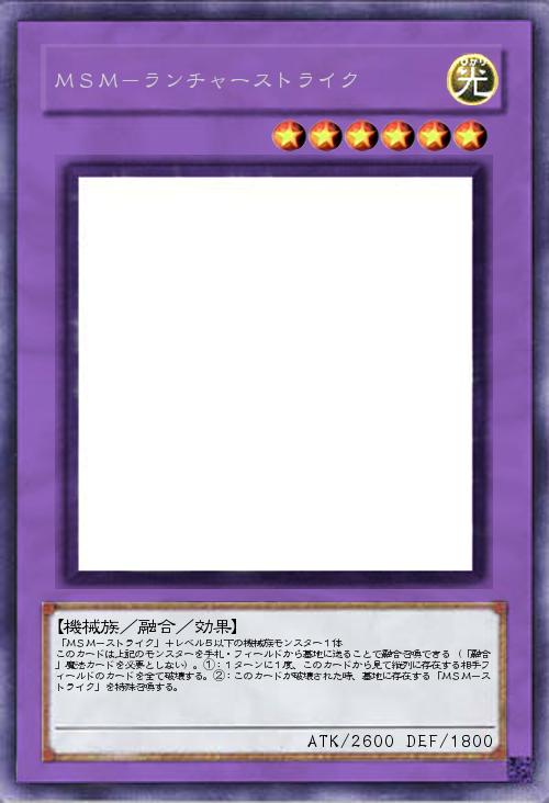 | 「MSM-ストライク」+レベル5以下の機械族モンスター1体 このカードは上記のモンスターを手札・フィールドから墓地に送ることで融合召喚できる(「融合」魔法カードを必要としない)。①:1ターンに1度、このカードから見て縦列に存在する相手フィールドのカードを全て破壊する。②:このカードが破壊された時、墓地に存在する「MSM-ストライク」を特殊召喚する。 | |||