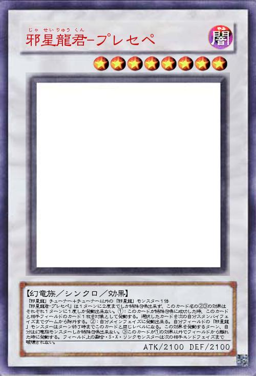 | 「邪星龍」チューナー+チューナー以外の「邪星龍」モンスター1体 「邪星龍君-プレセペ」は1ターンに2度までしか特殊召喚出来ず、このカード名の②③の効果はそれぞれ1ターンに1度しか発動出来ない。①:このカードが特殊召喚に成功した時、このカードと相手フィールドのカード1枚を対象として発動する。選択したカードを次の自分スタンバイフェイズまでゲームから除外する。②:自分メインフェイズに発動出来る。自分フィールドの「邪星龍」モンスターはターン終了時までこのカードと同じレベルになる。この効果を発動するターン、自分は幻竜族モンスターしか特殊召喚出来ない。③このカードが①の効果以外でフィールドから離れた時に発動する。フィールド上の融合・S・X・リンクモンスターは次の相手エンドフェイズまで破壊されない。 | |||