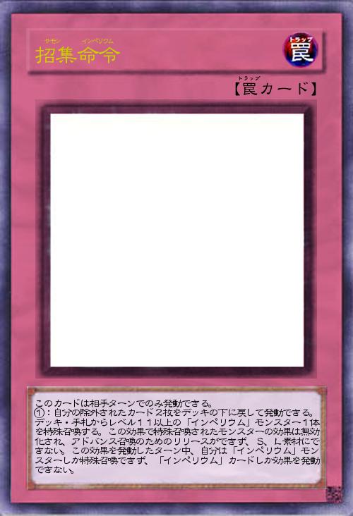 | このカードは相手ターンでのみ発動できる。 ①:自分の除外されたカード2枚をデッキの下に戻して発動できる。デッキ・手札からレベル11以上の「インペリウム」モンスター1体を特殊召喚する。この効果で特殊召喚されたモンスターの効果は無効化され、アドバンス召喚のためのリリースができず、S、L素材にできない。この効果を発動したターン中、自分は「インペリウム」モンスターしか特殊召喚できず、「インペリウム」カードしか効果を発動できない。 | |||