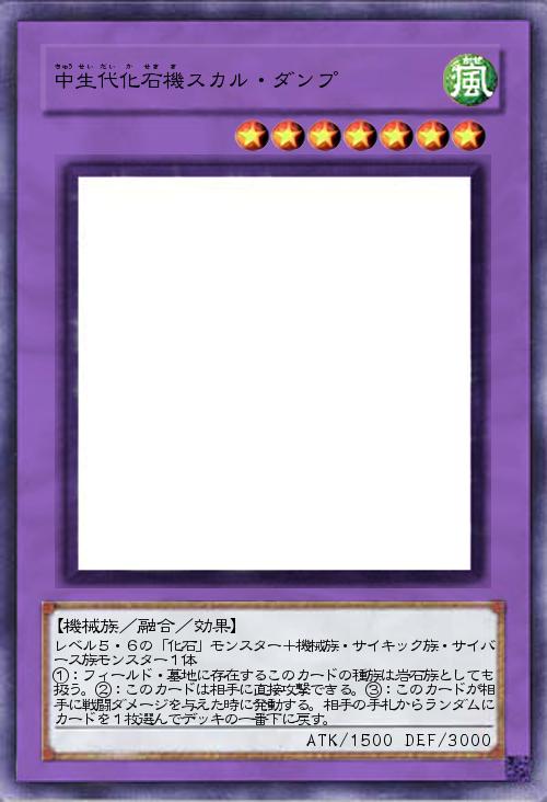 | レベル5・6の「化石」モンスター+機械族・サイキック族・サイバース族モンスター1体 ①:フィールド・墓地に存在するこのカードの種族は岩石族としても扱う。②:このカードは相手に直接攻撃できる。③:このカードが相手に戦闘ダメージを与えた時に発動する。相手の手札からランダムにカードを1枚選んでデッキの一番下に戻す。 | |||