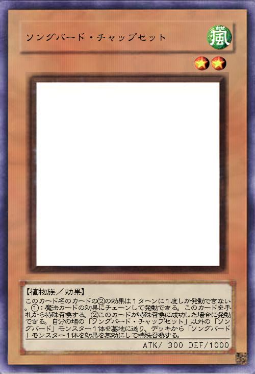 | このカード名のカードの②の効果は1ターンに1度しか発動できない。①:魔法カードの効果にチェーンして発動できる。このカードを手札から特殊召喚する。②このカードが特殊召喚に成功した場合に発動できる。自分の場の「ソングバード・チャップセット」以外の「ソングバード」モンスター1体を墓地に送り、デッキから「ソングバード」モンスター1体を効果を無効にして特殊召喚する。 | |||