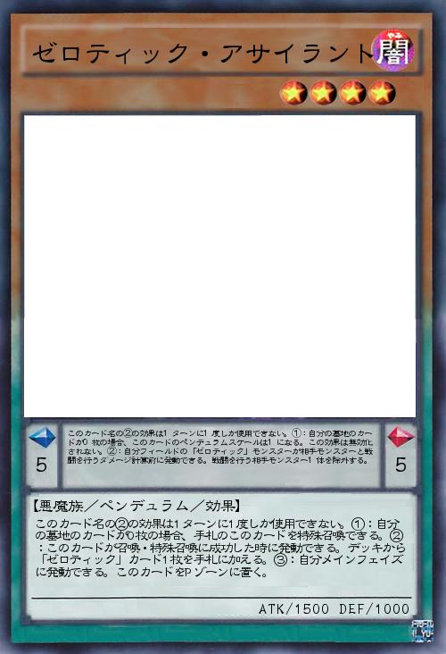 | このカード名の②の効果は1ターンに1度しか使用できない。①:自分の墓地のカードが0枚の場合、手札のこのカードを特殊召喚できる。②:このカードが召喚・特殊召喚に成功した時に発動できる。デッキから「ゼロティック」カード1枚を手札に加える。③:自分メインフェイズに発動できる。このカードをPゾーンに置く。 | |||