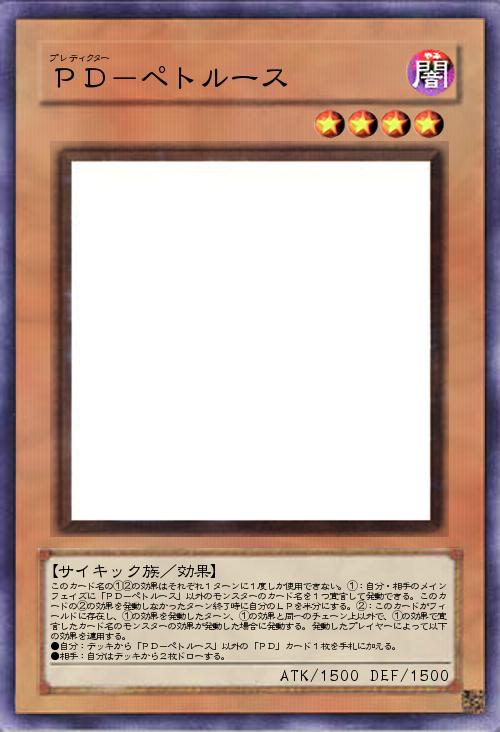 | このカード名の①②の効果はそれぞれ1ターンに1度しか使用できない。①:自分・相手のメインフェイズに「PD-ペトルース」以外のモンスターのカード名を1つ宣言して発動できる。このカードの②の効果を発動しなかったターン終了時に自分のLPを半分にする。②:このカードがフィールドに存在し、①の効果を発動したターン、①の効果と同一のチェーン上以外で、①の効果で宣言したカード名のモンスターの効果が発動した場合に発動する。発動したプレイヤーによって以下の効果を適用する。 ●自分:デッキから「PD-ペトルース」以外の「PD」カード1枚を手札に加える。 ●相手:自分はデッキから2枚ドローする。 | |||
