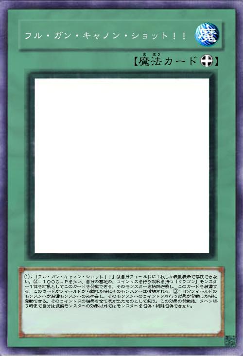 | ①:「フル・ガン・キャノン・ショット!!」は自分フィールドに1枚しか表側表示で存在できない。②:1000LPを払い、自分の墓地の、コイントスを行う効果を持つ「ドラゴン」モンスター1体を対象としてこのカードを発動できる。そのモンスターを特殊召喚し、このカードを装備する。このカードがフィールドから離れた時にそのモンスターは破壊される。③:自分フィールドのモンスターが装備モンスターのみ存在し、そのモンスターのコイントスを行う効果が発動した時に発動できる。そのコイントスの結果を全て表が出たものとして扱う。この効果の発動後、ターン終了時まで自分は装備モンスターの効果以外ではモンスターを召喚・特殊召喚できない。 | |||