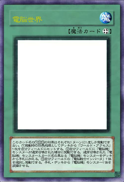 | このカード名の①②③の効果はそれぞれ1ターンに1度しか発動できない。①発動時の効果処理としてデッキから「ワールド・アクセス」1枚を自分フィールドにセットする。②自分フィールドに「電脳機」モンスターが通常召喚された場合に発動できる。通常召喚された「電脳機」モンスターとカード名の異なる「電脳機」モンスターをデッキから手札に加える。③自分フィールドの「電脳戦士インバータ」1体を選択し発動できる。手札・デッキから「電脳機」モンスター1体を装備させる。 | |||