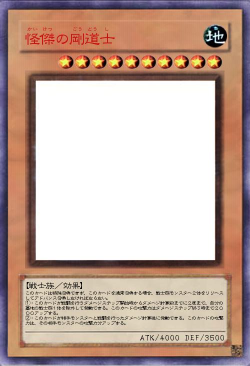 | このカードは特殊召喚できず、このカードを通常召喚する場合、戦士族モンスター2体をリリースしてアドバンス召喚しなければならない。 ①:このカードが戦闘を行うダメージステップ開始時からダメージ計算前までに2度まで、自分の墓地の戦士族1体を除外して発動できる。このカードの攻撃力はダメージステップ終了時まで2000アップする。 ②:このカードが相手モンスターと戦闘を行ったダメージ計算後に発動できる。このカードの攻撃力は、その相手モンスターの攻撃力分アップする。 | |||