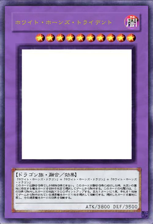 「ホワイト・ホーンズ・ドラゴン」+「ホワイト・ホーンズ・ドラゴン」+「ホワイト・ホーンズ・ドラゴン」 このカードは融合召喚でしか特殊召喚できない。このカードが融合召喚に成功した時、お互いの墓地に存在する魔法カードを合計5枚まで選択してゲームから除外する。このカードの攻撃力は、この効果で除外したカードの枚数×300ポイントアップする。また1ターンに1度、手札を1枚捨てゲームから除外されている通常魔法カード1枚を選択して発動できる。選択したカードを墓地に戻し、その通常魔法カードの効果を発動する。 |