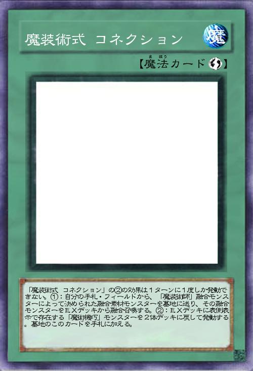 | 「魔装術式 コネクション」の②の効果は1ターンに1度しか発動できない。①:自分の手札・フィールドから、「魔装術師」融合モンスターによって決められた融合素材モンスターを墓地に送り、その融合モンスターをEXデッキから融合召喚する。②:EXデッキに表側表示で存在する「魔術機巧」モンスターを2体デッキに戻して発動する。墓地のこのカードを手札に加える。 | |||