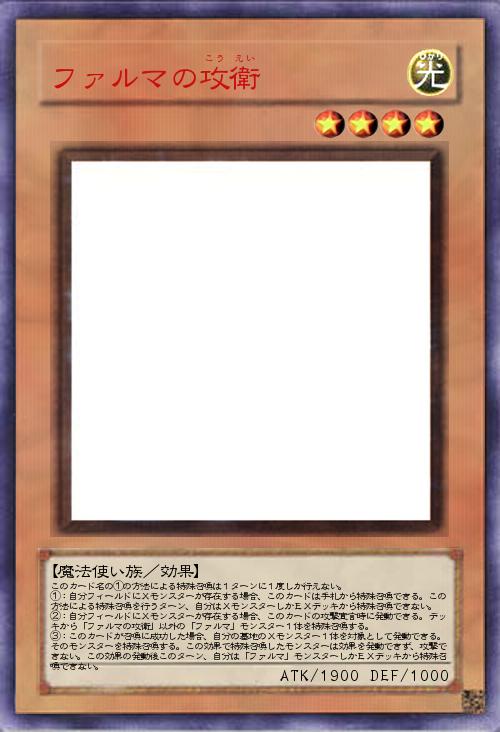 | このカード名の①の方法による特殊召喚は1ターンに1度しか行えない。 ①:自分フィールドにXモンスターが存在する場合、このカードは手札から特殊召喚できる。この方法による特殊召喚を行うターン、自分はXモンスターしかEXデッキから特殊召喚できない。 ②:自分フィールドにXモンスターが存在する場合、このカードの攻撃宣言時に発動できる。デッキから「ファルマの攻衛」以外の「ファルマ」モンスター1体を特殊召喚する。 ③:このカードが召喚に成功した場合、自分の墓地のXモンスター1体を対象として発動できる。そのモンスターを特殊召喚する。この効果で特殊召喚したモンスターは効果を発動できず、攻撃できない。この効果の発動後このターン、自分は「ファルマ」モンスターしかEXデッキから特殊召喚できない。 | |||