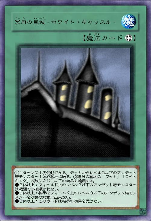 | ①1ターンに1度発動できる、デッキからレベル3以下のアンデット族モンスター1体を墓地に送る。②自分の墓地の「ワイト」「ワイトキング」の数に応じて以下の効果を適用する。 ●3体以上:フィールド上のレベル3以下のアンデット族モンスターは戦闘では破壊されない。 ●5体以上:相手はフィールド上のレベル3以下のアンデット族モンスターを効果の対象に出来ない。 ●8体以上:このカードは相手の効果を受けない。 | |||