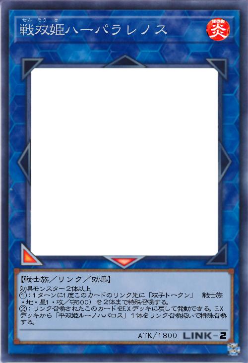 | 効果モンスター2体以上 ①:1ターンに1度このカードのリンク先に「双子トークン」(戦士族・地・星1・攻/守600)を2体まで特殊召喚する。 ②:リンク召喚されたこのカードをEXデッキに戻して発動できる。EXデッキから「平双姫ルーノハパロス」1体をリンク召喚扱いで特殊召喚する。 | |||