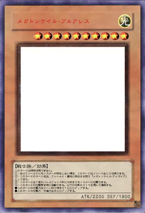 | このカードは特殊召喚できない。 ①:自分フィールドにモンスターが存在しない場合、このカードはリリースなしで召喚できる。 ②:このカードのカード名は、フィールド・墓地に存在する限り「メガトンケイル-アイガイア」として扱う。 ③:このカードは1度のバトルフェイズ中に3回までモンスターに攻撃できる。 ④:このカードの攻撃宣言時に発動できる。以下の効果から1つを選んで適用する。 ●このカードの攻撃力はターン終了時まで1000アップする。 ●このカードの攻撃力・守備力は500アップする。 | |||