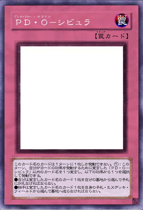 | このカード名のカードは1ターンに1枚しか発動できない。①:このターン、自分がカードの効果を発動するために宣言した「PD・O-シビュラ」以外のカード名を1つ宣言し、以下の効果から1つを選択して発動できる。 ●自分は宣言したカード名のカード1枚を自分の墓地から選んで手札に加えなければならない。 ●相手は宣言したカード名のカード1枚を自身の手札・EXデッキ・フィールドから選んで墓地へ送らなければならない。 | |||