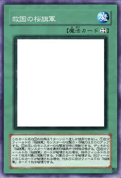 | このカード名の②の効果は1ターンに1度しか使用できない。①自分フィールドの「桜旗軍」モンスターの攻撃力・守備力は500アップする。②お互いのモンスターの攻撃宣言時に発動できる。デッキから「桜旗軍」モンスター1体を裏側守備表示で特殊召喚する。③自分フィールドの「桜旗軍」カードが破壊された場合、相手フィールドのカード1枚を対象に発動できる。対象のカードを破壊する。④フィールドのこのカードが破壊される場合、代わりに自分フィールドの「桜旗軍」カード1枚を破壊できる。 | |||