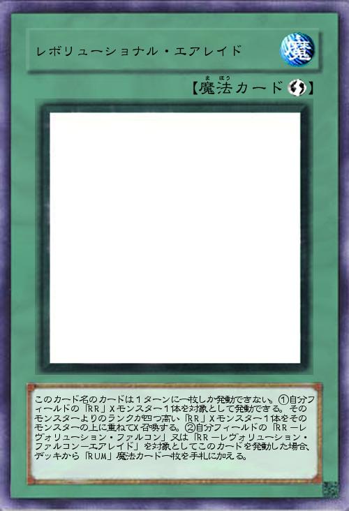 | このカード名のカードは1ターンに一枚しか発動できない。①自分フィールドの「RR」Xモンスター1体を対象として発動できる。そのモンスターよりのランクが四つ高い「RR」Xモンスター1体をそのモンスターの上に重ねてX召喚する。②自分フィールドの「RR-レヴォリューション・ファルコン」又は「RR-レヴォリューション・ファルコン-エアレイド」を対象としてこのカードを発動した場合、デッキから「RUM」魔法カード一枚を手札に加える。 | |||