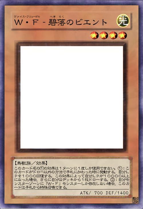 | このカード名の①の効果は1ターンに1度しか使用できない。①:このカードがドロー以外の方法で手札に加わった時に発動する。自分LPを1000回復する。この効果によって自分LPが10000以上になった場合、さらに自分はデッキから1枚ドローする。②:自分モンスターゾーンに「W・F」モンスターしか存在しない場合、このカードは手札から特殊召喚できる。 | |||