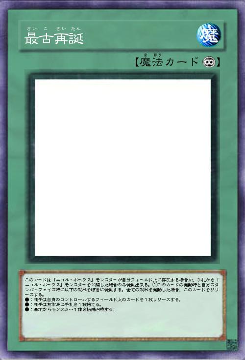 | このカードは「ニコル・ボーラス」モンスターが自分フィールド上に存在する場合か、手札から「ニコル・ボーラス」モンスターを公開した場合のみ発動出来る。①このカードの発動時と自分スタンバイフェイズ時に以下の効果を順番に発動する。全ての効果を発動した場合、このカードをリリースする。 ●:相手は自身のコントロールするフィールド上のカードを1枚リリースする。 ●:相手は無作為に手札を1枚捨てる。 ●:墓地からモンスター1体を特殊召喚する。 | |||