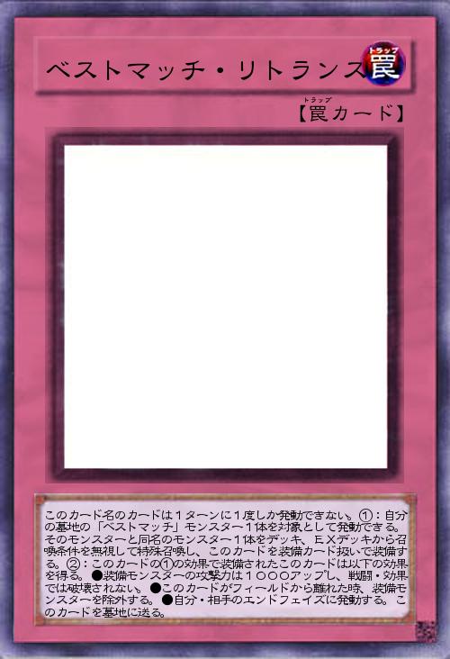 | このカード名のカードは1ターンに1度しか発動できない。①:自分の墓地の「ベストマッチ」モンスター1体を対象として発動できる。そのモンスターと同名のモンスター1体をデッキ、EXデッキから召喚条件を無視して特殊召喚し、このカードを装備カード扱いで装備する。②:このカードの①の効果で装備されたこのカードは以下の効果を得る。●装備モンスターの攻撃力は1000アップし、戦闘・効果では破壊されない。●このカードがフィールドから離れた時、装備モンスターを除外する。●自分・相手のエンドフェイズに発動する。このカードを墓地に送る。 | |||