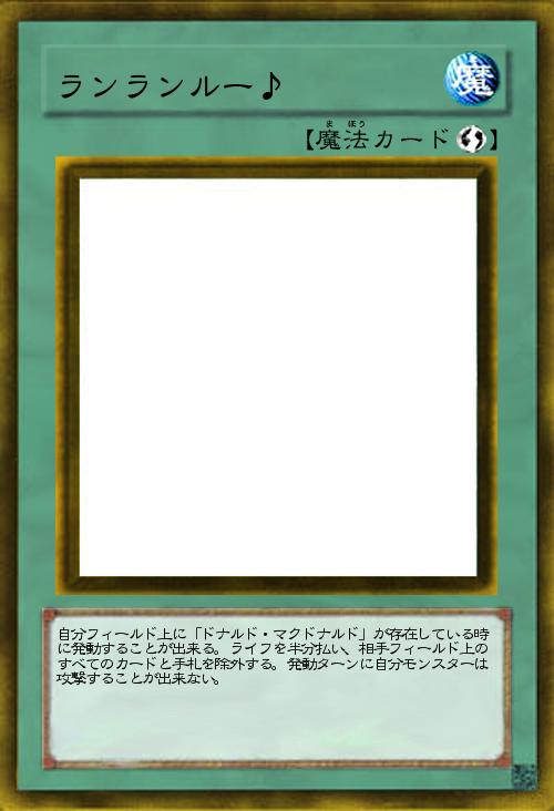 | 自分フィールド上に「ドナルド・マクドナルド」が存在している時に発動することが出来る。ライフを半分払い、相手フィールド上のすべてのカードと手札を除外する。発動ターンに自分モンスターは攻撃することが出来ない。 | |||