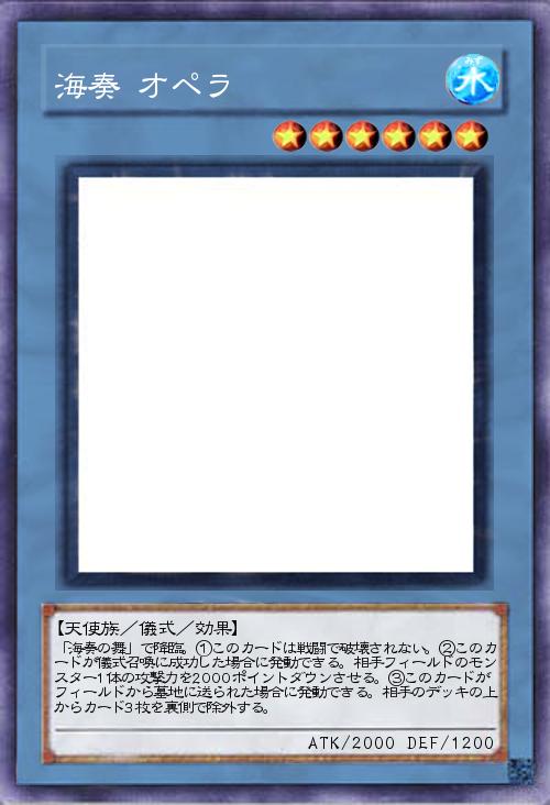 | 「海奏の舞」で降臨。①このカードは戦闘で破壊されない。②このカードが儀式召喚に成功した場合に発動できる。相手フィールドのモンスター1体の攻撃力を2000ポイントダウンさせる。③このカードがフィールドから墓地に送られた場合に発動できる。相手のデッキの上からカード3枚を裏側で除外する。 | |||