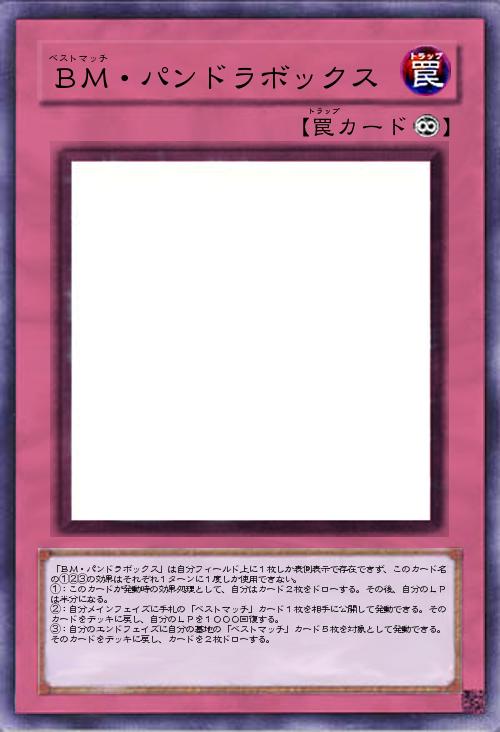 | 「BM・パンドラボックス」は自分フィールド上に1枚しか表側表示で存在できず、このカード名の①②③の効果はそれぞれ1ターンに1度しか使用できない。 ①:このカードが発動時の効果処理として、自分はカード2枚をドローする。その後、自分のLPは半分になる。 ②:自分メインフェイズに手札の「ベストマッチ」カード1枚を相手に公開して発動できる。そのカードをデッキに戻し、自分のLPを1000回復する。 ③:自分のエンドフェイズに自分の墓地の「ベストマッチ」カード5枚を対象として発動できる。そのカードをデッキに戻し、カードを2枚ドローする。 | |||