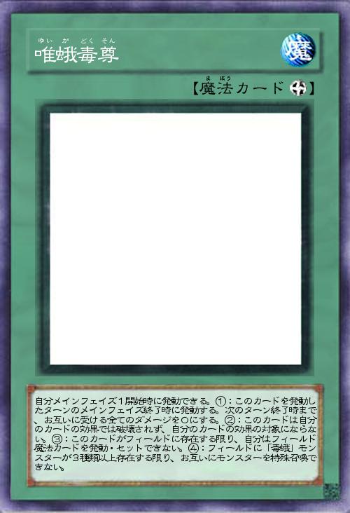 | 自分メインフェイズ1開始時に発動できる。①:このカードを発動したターンのメインフェイズ終了時に発動する。次のターン終了時まで、お互いに受ける全てのダメージを0にする。②:このカードは自分のカードの効果では破壊されず、自分のカードの効果の対象にならない。③:このカードがフィールドに存在する限り、自分はフィールド魔法カードを発動・セットできない。④:フィールドに「毒蛾」モンスターが3種類以上存在する限り、お互いにモンスターを特殊召喚できない。 | |||