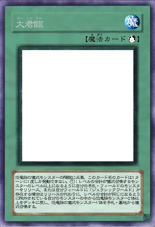 | 恐竜族の儀式モンスターの降臨に必要。このカード名のカードは1ターンに1度しか発動できない。①:レベルの合計が儀式召喚するモンスターのレベル以上になるように自分の手札・フィールドのモンスターをリリース、または自分フィールドに「ジュラシックワールド」が存在する場合はリリースの代わりに、レベルの合計が同じになるように除外されている自分のモンスターの中から恐竜族モンスター2体以上をデッキに戻し、恐竜族の儀式モンスター1体を手札・墓地から儀式召喚する。 | |||