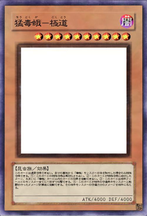 | このカードは通常召喚できない。自分の墓地から「毒蛾」モンスター6体を除外した場合のみ特殊召喚できる。①:このカードの特殊召喚は無効化されない。②:このカードが特殊召喚に成功したターン、お互いに「毒蛾」カード以外のカードの効果を発動できない。③:このカードは相手フィールドのモンスター全てに1回ずつ攻撃できる。④:このカードが相手の守備表示モンスターと戦闘を行ったダメージ計算後に発動できる。その相手モンスターの守備力分のダメージを相手に与える。 | |||
