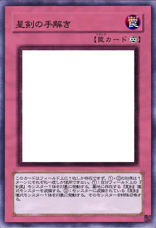 | このカードはフィールド上に1枚しか存在できず、①・②の効果は1ターンにそれぞれ一度しか使用できない。①:自分フィールド上の『剣星』モンスター1体を対象に発動する。墓地に存在する『星剣』儀式モンスターを装備する。②:モンスターに装備されている『星剣』儀式モンスター1体を対象に発動する。そのモンスターを特殊召喚する。 | |||