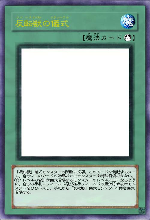| 「反転獣」儀式モンスターの降臨に必要。このカードを発動するターン、自分はこのカードの効果以外でモンスターを特殊召喚できない。①:レベルの合計が儀式召喚するモンスターのレベル以上になるように、自分の手札・フィールド及び相手フィールドの裏側守備表示モンスターをリリースし、手札から「反転獣」儀式モンスター1体を儀式召喚する。 | |||