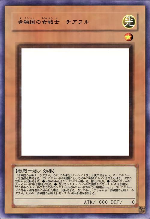 | 「希鱗国の女戦士 チアフル」の(3)の効果は1ターンに1度しか使用できない。(1):このカードは直接攻撃できる。(2):このカードの戦闘によって相手に戦闘ダメージを与えた場合、以下の効果から発動できる。●:相手の手札をランダムに1枚選んで、墓地に送る。●:相手のデッキの上からカード3枚を墓地に送る。●:自分モンスターゾーンの表側表示のモンスター1体を選び、次の相手のターン終了までそのモンスターは相手のカード効果では破壊されない。(3):このカードの召喚・特殊召喚に成功した場合、発動できる。自分の手札・デッキから「希鱗国の女戦士 チアフル」以外の「希鱗国の女戦士」モンスター1体を特殊召喚する。 | |||