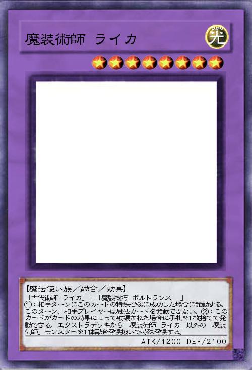 | 「古代術師 ライカ」+「魔獣機巧 ボルトランス 」 ①:相手ターンにこのカードの特殊召喚に成功した場合に発動する。このターン、相手プレイヤーは魔法カードを発動できない。②:このカードがカードの効果によって破壊された場合に手札を1枚捨てて発動できる。エクストラデッキから「魔装術師 ライカ」以外の「魔装術師」モンスターを1体融合召喚扱いで特殊召喚する。 | |||