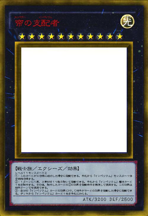 | レベル11モンスター×2 ①:このカードがX召喚に成功した場合に発動できる。手札から「インペリウム」モンスター1体を特殊召喚する。 ②:1ターンに1度、X素材を1つ取り除いて発動できる。手札から「インペリウム」魔法カード1枚を除外する。その後、除外したカードの②の効果を発動条件を無視して使用する。この効果は相手ターンでも使用できる。 ③:自分の「インペリウム」カードの効果に対して相手がカードの効果を発動した場合に発動できる。デッキから「インペリウム」カード1枚を手札に加える。 | |||