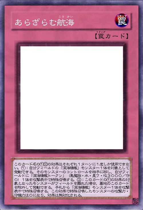 | このカード名の①②の効果はそれぞれ1ターンに1度しか使用できない。①:自分フィールドの「深海棲艦」モンスター1体を対象として発動できる。そのモンスターのコントロールを相手に移し、自分フィールドに「深海棲艦トークン」(悪魔族・水・星7・攻3000/守0)1体を攻撃表示で特殊召喚する。②:このカードの①の効果の対象となったモンスターがフィールドを離れた場合、墓地のこのカードを除外して発動できる。手札から「深海棲艦」モンスター1体を攻撃表示で特殊召喚する。この効果で特殊召喚したモンスターの攻撃力・守備力は0になり、効果は無効化される。 | |||