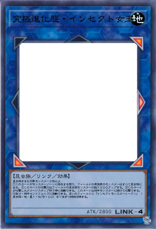 「インセクト女王をリンクモンスターにリメイクしました。究極変異態と同様の攻撃力とモンスターへの連続攻撃が可能ですが、こちらはリリースなしでできます。元祖インセクト女王と同様の自己強化も行え、フィールドのモンスターを昆虫族にすることができます。トークンを生成する効果は相手フィールドにも召喚する仕様にしました。」(2019-08-25 10:08)