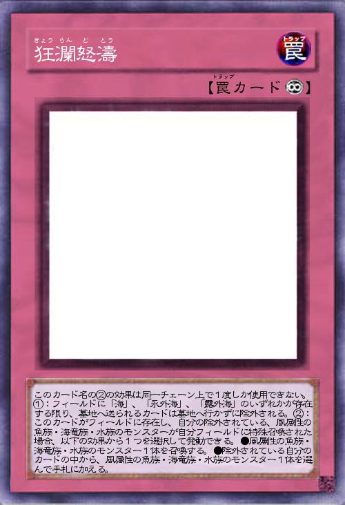 | このカード名の②の効果は同一チェーン上で1度しか使用できない。①:フィールドに「海」、「永外海」、「露外海」のいずれかが存在する限り、墓地へ送られるカードは墓地へ行かずに除外される。②:このカードがフィールドに存在し、自分の除外されている、風属性の魚族・海竜族・水族のモンスターが自分フィールドに特殊召喚された場合、以下の効果から1つを選択して発動できる。●風属性の魚族・海竜族・水族のモンスター1体を召喚する。●除外されている自分のカードの中から、風属性の魚族・海竜族・水族のモンスター1体を選んで手札に加える。 | |||