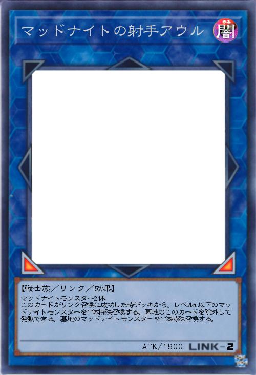 | マッドナイトモンスター2体 このカードがリンク召喚に成功した時デッキから、レベル4以下のマッドナイトモンスターを1体特殊召喚する。墓地のこのカードを除外して発動できる。墓地のマッドナイトモンスターを1体特殊召喚する。 | |||