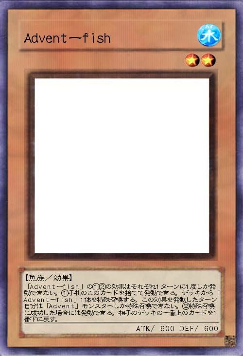 | 「Adventーfish」の①②の効果はそれぞれ1ターンに1度しか発動できない。①手札のこのカードを捨てて発動できる。デッキから「Adventーfish」1体を特殊召喚する。この効果を発動したターン自分は「Advent」モンスターしか特殊召喚できない。②特殊召喚に成功した場合には発動できる。相手のデッキの一番上のカードを1番下に戻す。 | |||