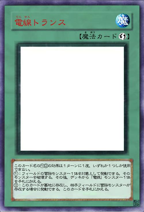 | このカード名の①②の効果は1ターンに1度、いずれか1つしか使用できない。 ①:フィールドの雷族モンスター1体を対象として発動できる。そのモンスターを破壊する。その後、デッキから「電線」モンスター1体を手札に加える。 ②:このカードが墓地に存在し、相手フィールドに雷族モンスターが存在する場合に発動できる。このカードを手札に加える。 | |||