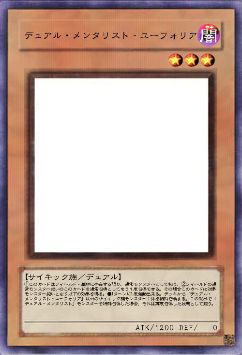 | ①このカードはフィールド・墓地に存在する限り、通常モンスターとして扱う。②フィールドの通常モンスター扱いのこのカードを通常召喚としてもう1度召喚できる。その場合このカードは効果モンスター扱いとなり以下の効果を得る。●1ターンに1度発動出来る。デッキから「デュアル・メンタリスト‐ユーフォリア」以外のサイキック族モンスター1体を特殊召喚する。この効果で「デュアル・メンタリスト」モンスターを特殊召喚した場合、それは再度召喚した状態として扱う。 | |||