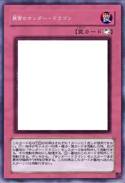 | このカード名の①②の効果はそれぞれ1ターンに1度しか使用できない。①:相手がモンスター効果・魔法・罠カードを発動した時、自分の墓地の「サンダー・ドラゴン」モンスター2体を除外して発動できる。その発動を無効にし破壊する。②:墓地のこのカードを除外して発動できる。デッキから、「サンダー・ドラゴン」モンスター1体を裏側守備表示で特殊召喚する。この効果はこのカードが墓地へ送られたターンには発動できない。 | |||
