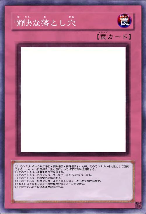 | ①:モンスター1体のみが召喚・反転召喚・特殊召喚された時、そのモンスターを対象として発動できる。サイコロを1度振り、出た目によって以下の効果を適用する。 1:そのモンスターを裏側表示で除外する。 2:そのモンスターのコントローラーはデッキから2枚ドローする。 3:そのモンスターの攻撃力は倍になる。 4:そのモンスターのコントロールをそのモンスターから見て相手に移す。 5:お互いにそのモンスターの攻撃力分のダメージを受ける。 6:そのモンスターの効果は無効化される。 | |||