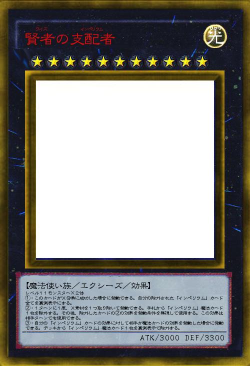 | レベル11モンスター×2体 ①:このカードがX召喚に成功した場合に発動できる。自分の除外された「インペリウム」カード全てを裏側表示にする。 ②:1ターンに1度、X素材を1つ取り除いて発動できる。手札から「インペリウム」魔法カード1枚を除外する。その後、除外したカードの②の効果を発動条件を無視して使用する。この効果は相手ターンでも使用できる。 ③:自分の「インペリウム」カードの効果に対して相手が魔法カードの効果を発動した場合に発動できる。デッキから「インペリウム」魔法カード1枚を裏側表示で除外する。 | |||