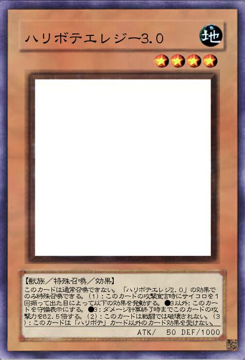 | このカードは通常召喚できない。「ハリボテエレジ2.0」の効果でのみ特殊召喚できる。(1):このカードの攻撃宣言時にサイコロを1回振って出た目によって以下の効果を発動する。●3以外:このカードを守備表示にする。●3:ダメージ計算終了時までこのカードの攻撃力を82.5倍する。(2):このカードは戦闘では破壊されない。(3):このカードは「ハリボテ」カード以外のカード効果を受けない。 | |||