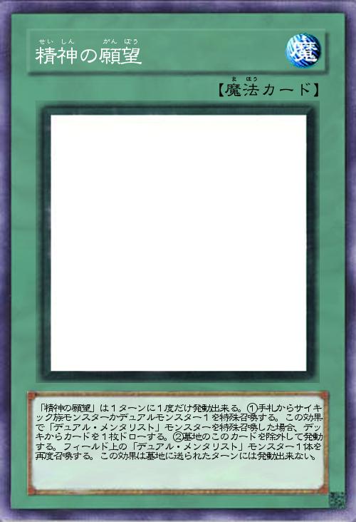 | 「精神の願望」は1ターンに1度だけ発動出来る。①手札からサイキック族モンスターかデュアルモンスター1を特殊召喚する。この効果で「デュアル・メンタリスト」モンスターを特殊召喚した場合、デッキからカードを1枚ドローする。②墓地のこのカードを除外して発動する。フィールド上の「デュアル・メンタリスト」モンスター1体を再度召喚する。この効果は墓地に送られたターンには発動出来ない。 | |||
