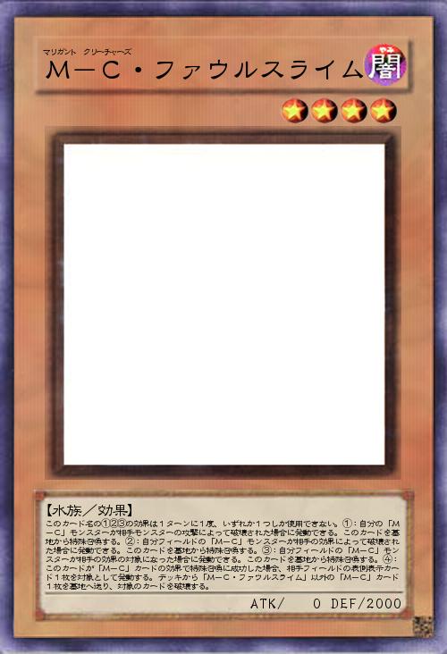 | このカード名の①②③の効果は1ターンに1度、いずれか1つしか使用できない。①:自分の「M-C」モンスターが相手モンスターの攻撃によって破壊された場合に発動できる。このカードを墓地から特殊召喚する。②:自分フィールドの「M-C」モンスターが相手の効果によって破壊された場合に発動できる。このカードを墓地から特殊召喚する。③:自分フィールドの「M-C」モンスターが相手の効果の対象になった場合に発動できる。このカードを墓地から特殊召喚する。④:このカードが「M-C」カードの効果で特殊召喚に成功した場合、相手フィールドの表側表示カード1枚を対象として発動する。デッキから「M-C・ファウルスライム」以外の「M-C」カード1枚を墓地へ送り、対象のカードを破壊する。 | |||