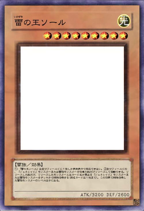| ①:「雷の王ソール」は自分フィールドに1体しか表側表示で存在できない。②自分フィールドの、「ジェネレイド」モンスターまたは雷族モンスターを任意の数だけリリースして発動できる。リリースした数だけ、リリースしたモンスターとはカード名が異なる「ジェネレイド」モンスターまたは雷族モンスターをデッキから特殊召喚する(同名カードは1枚まで)。この効果で特殊召喚した雷族モンスターのレベルは9になる。 | |||