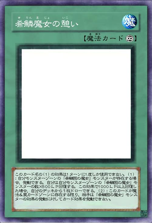 | このカード名の(1)の効果は1ターンに1度しか使用できない。(1):自分モンスターゾーンの「希鱗国の魔女」モンスターが存在する場合、発動できる。自分は自分モンスターゾーンの「希鱗国の魔女」モンスターの数×500LP回復する。この効果で1000LP以上回復した場合、自分のデッキから1枚ドローできる。(2):このカードが魔法&罠カードゾーンに存在する限り、相手は「希鱗国の魔女」モンスターの効果の発動に対してカード効果を発動できない。 | |||