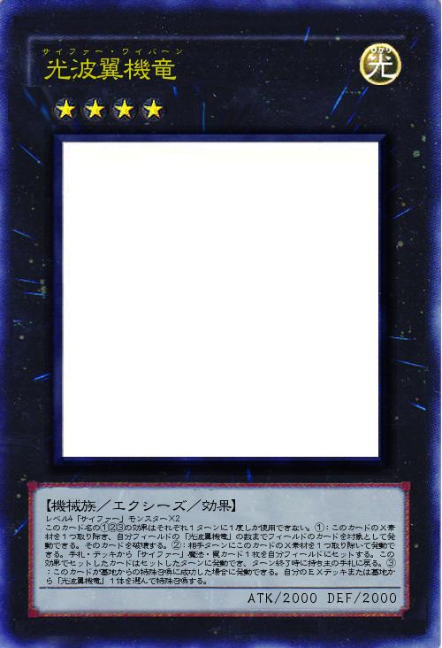 | レベル4「サイファー」モンスター×2 このカード名の①②③の効果はそれぞれ1ターンに1度しか使用できない。①:このカードのX素材を1つ取り除き、自分フィールドの「光波翼機竜」の数までフィールドのカードを対象として発動できる。そのカードを破壊する。②:相手ターンにこのカードのX素材を1つ取り除いて発動できる。手札・デッキから「サイファー」魔法・罠カード1枚を自分フィールドにセットする。この効果でセットしたカードはセットしたターンに発動でき、ターン終了時に持ち主の手札に戻る。③:このカードが墓地からの特殊召喚に成功した場合に発動できる。自分のEXデッキまたは墓地から「光波翼機竜」1体を選んで特殊召喚する。 | |||